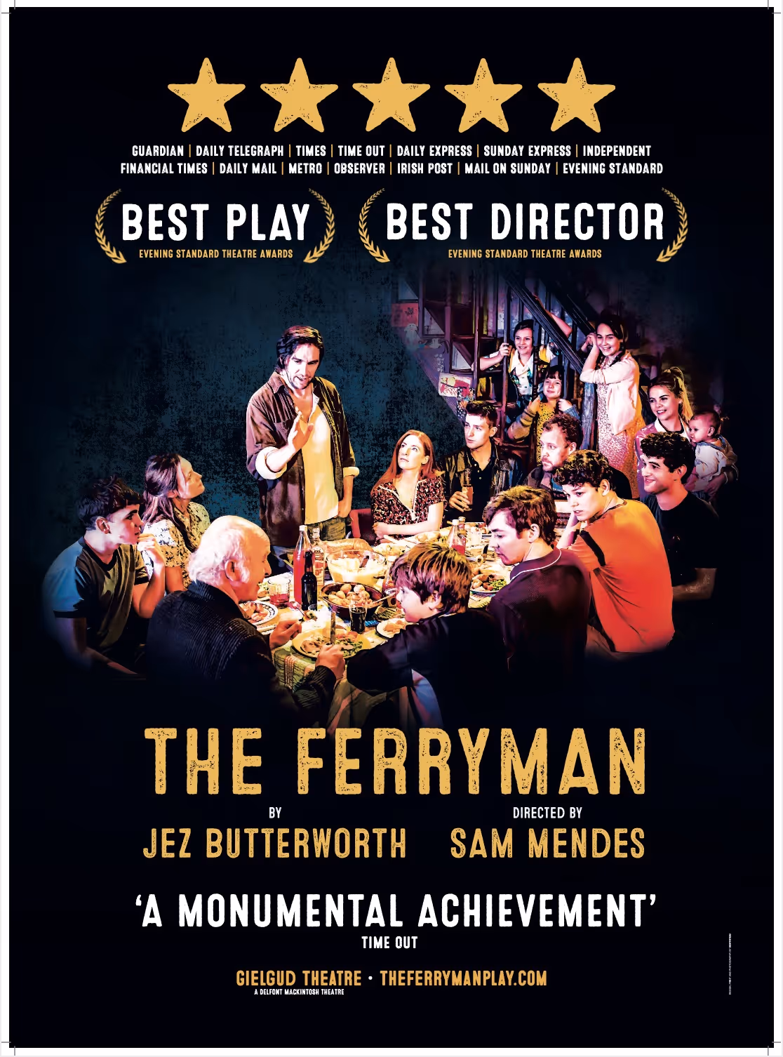 A Neal Street co-production with Sonia Friedman Productions and the Royal Court Theare, Jez Butterworth's epic play, The Ferryman, began at the Royal Court Theatre where it had its World Premiere on 24th April 2017. It was the fastest selling play in the theatre's history, and quickly transfered to the Gielgud Theatre for a twice-extended run from 27th June 2017, where it played to capacity houses for nigh on a year, with three companies of actors. In October 2018 the show transferred to Broadway starring the original cast. The show won multiple awards on both sides of the Atlantic.